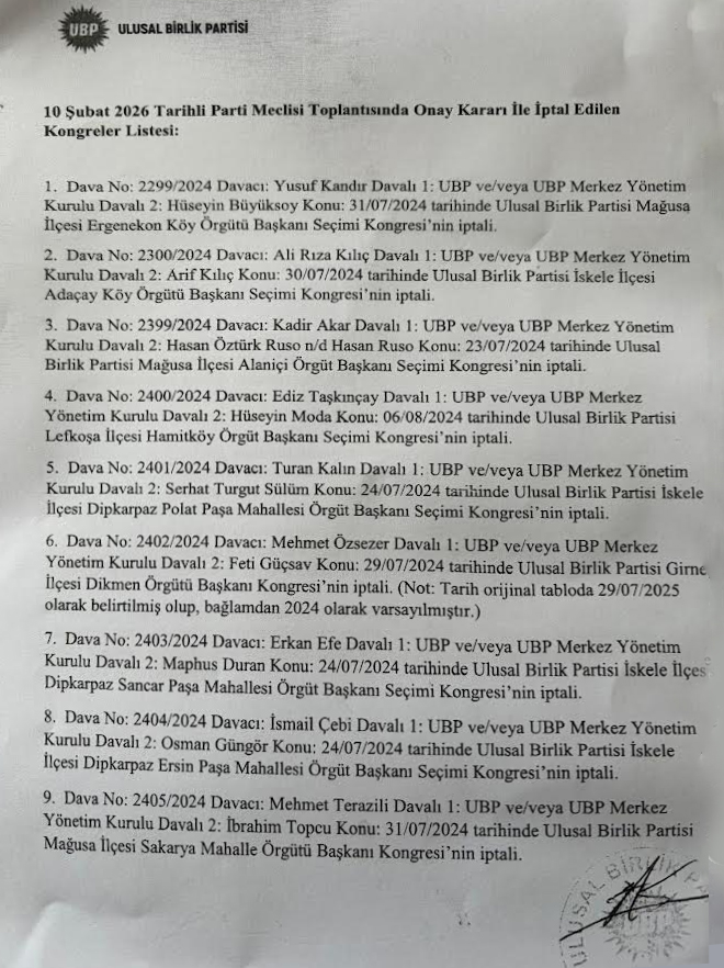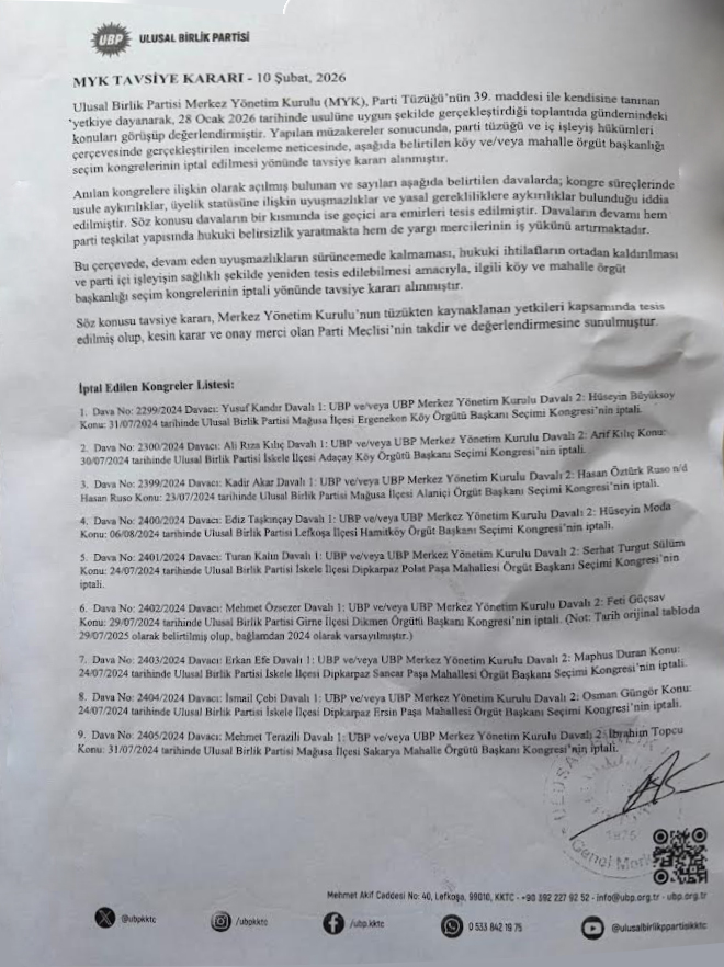 Gazeteci Sabahattin İsmail’in haberine göre; mahkeme kararını konusuz bırakmak amacıyla, KKTC’de iktidar partisi olan UBP’nin 2024 yılında yapılan Kurultayı öncesinde tamamlanmadığı iddia edilen köy ve mahalle kongreleri konusunda MYK’nın aldığı, “MYK Tavsiye Kararı” hukuken kurultayın geçerliliğini tartışmalı hale getirdi.