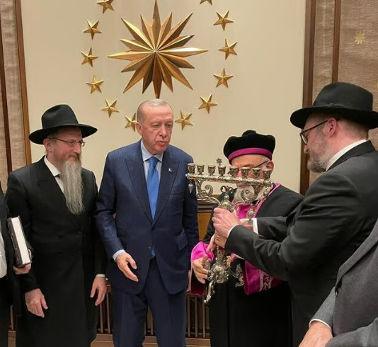 Fotoğraf; “İslam Devletlerindeki Hahamlar Birliği”’ni kuran CHABAD örgütünün 22 Aralık 2021 tarihinde Cumhurbaşkanlığı ziyaretinde Erdoğan ve Rav İsak Haleva…