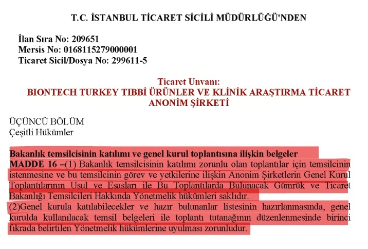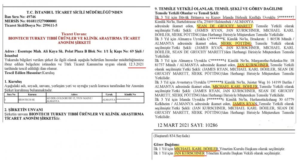 ASLANTEPE’nin paylaşımında dikkat çeken en önemli hususlardan biri, “BIONTECH TURKEY TIBBİ ÜRÜNLER VE KLİNİK ARAŞTIRMA TİCARET ANONİM ŞİRKETİ” nin 12 Mart 2021 tarihinde kurulmuş olmasıdır. (Kurulan şirkette Türk yok!)