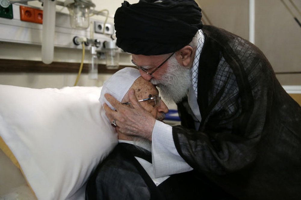 Fotoğraf: Siyonistler tarafından “şehit” edilen Ayetullah Ali Hamaney, Tahran'daki bir hastanede Ayetullah Mekarem Şirazi'yi ziyareti.
