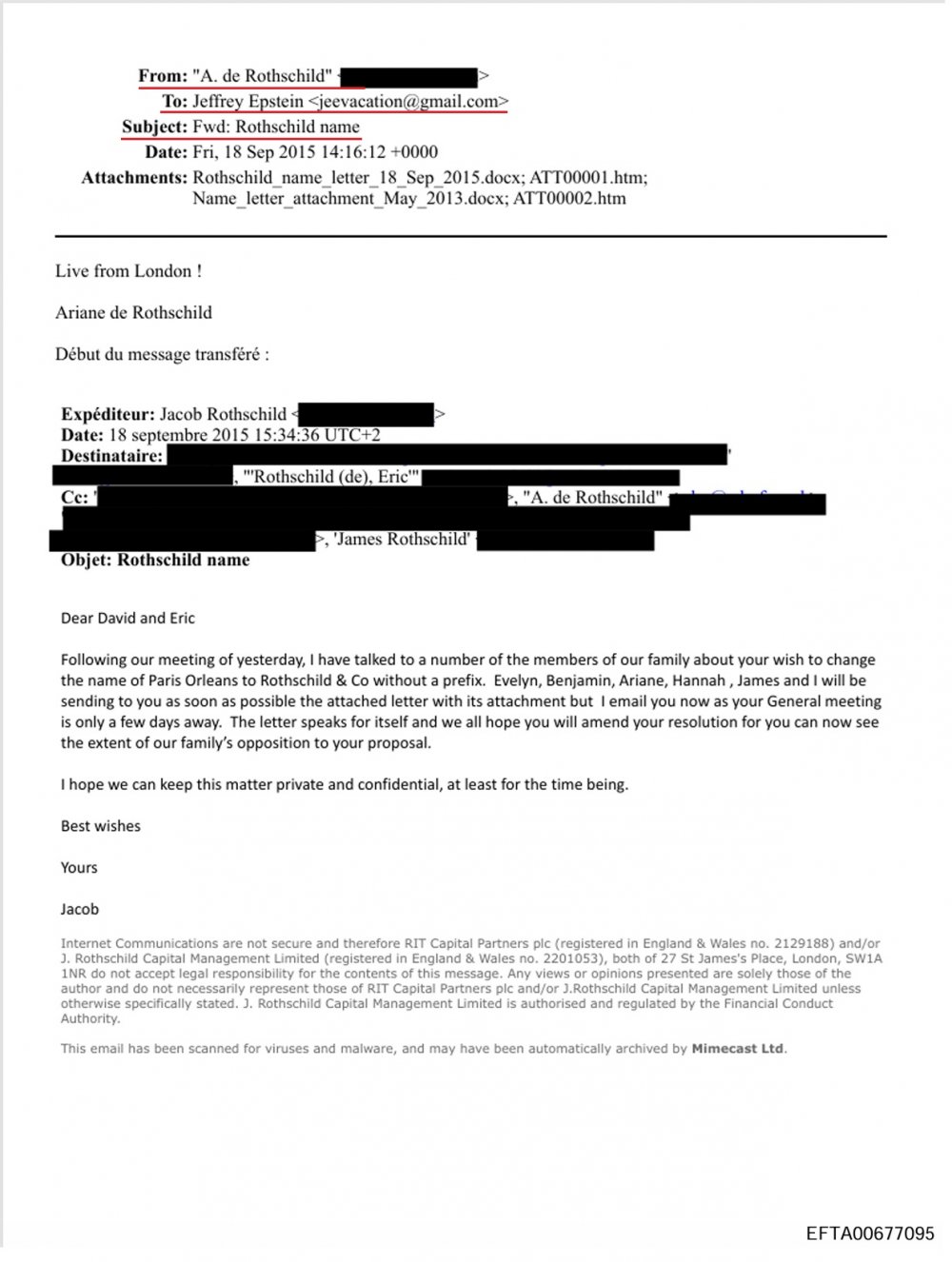 Epstein dosyasında, Rothschild para imparatorluğunun temsilcisi olan Jacob Rothschild’un, Sayın David ve Eric, 'James Rothschild'a hitaben 10 Eylül 2015 tarihinde yazdığı e-mail şu cümle ile bitiyor: