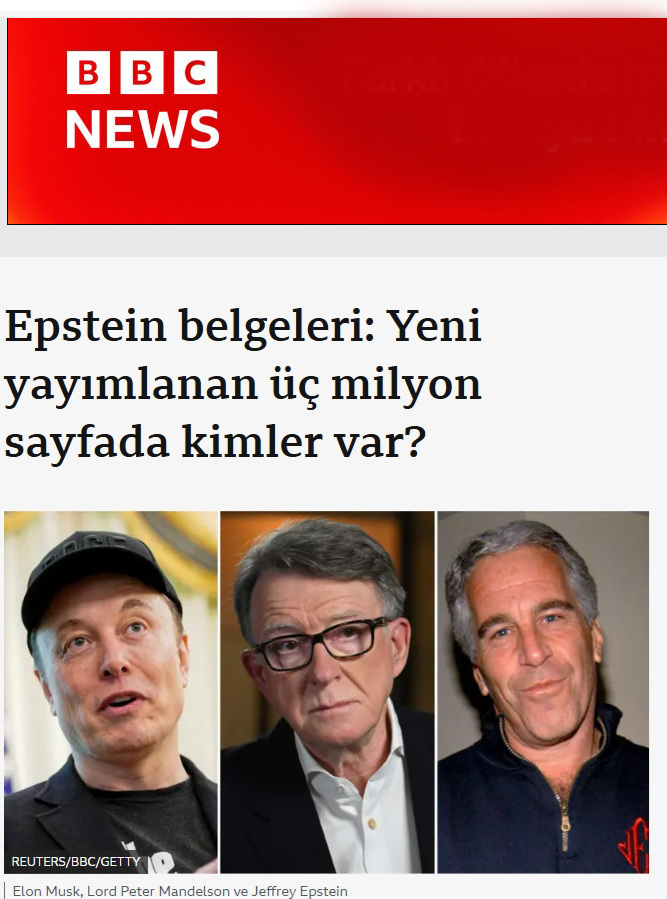 BBC, 31 Ocak 2026 tarihli “Epstein belgeleri: Yeni yayımlanan üç milyon sayfada kimler var?” başlıklı haberinde, kamuoyunun dikkatini daha ilk anda tanıdık ve tartışmalı figürlere yöneltti. Haberin vitrini, Donald Trump, Elon Musk, Bill Gates gibi küresel boyutta tanınan isimler üzerinden kuruldu. Haber fotoğrafında Elon Musk, İngiltere’nin eski Washington Büyükelçisi Lord Peter Mandelson ve Jeffrey Epstein’in fotoğrafları birlikte kullanılarak haberin, “güvenilirlik” zemini görsel olarak pekiştirildi. (bkz)