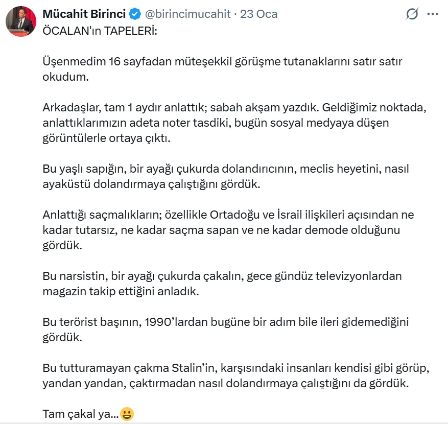 İlk tepki Avukat Mücahit Birinci’den geldi. Birinci, “ÖCALAN’IN TAPELERİ” başlıklı paylaşımında özetle; 16 sayfalık tutanakların okunduğunu, muhatabın 1990’lardan beri aynı yerde olduğunu; tutarsız, demode, çözüm üretmeyen ve tek derdi görünür olmak olan bu muhatabın, artık gerçeklerle herkesin gözü önünde bulunduğunu söylüyordu.