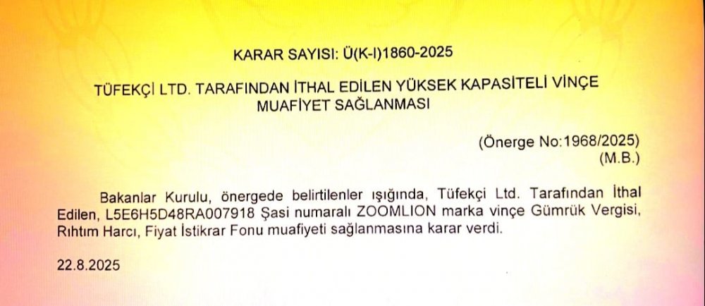Başbakan Ünal Üstel'in Ağustos 2025'de Bakanlar Kurulu'ndan geçirdiği "Ü (K-1) 1860-2025 " sayılı karara göre, "Tüfekçi Ltd. tarafından ithal edilen yüksek kapasiteli vinç için Gümrük Vergisi, Rıhtım Harcı ve Fiyat İstikrar Fonu muafiyeti" sağlandı.