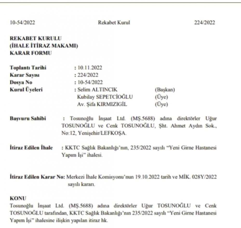 Ne ki, elenen Tosunoğlu İnşaat şirketi, Selim ALTINCIK başkanlığındaki Rekabet Kurulu'na itiraz etti ve haklı bulundu.