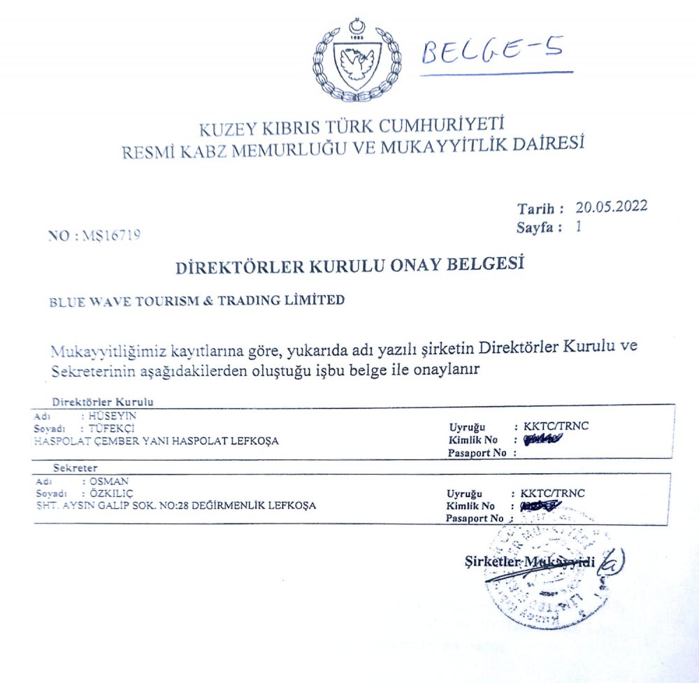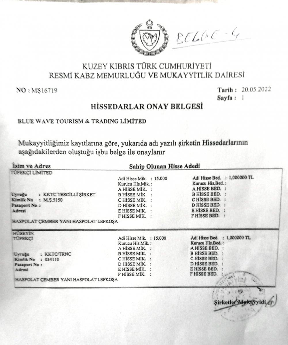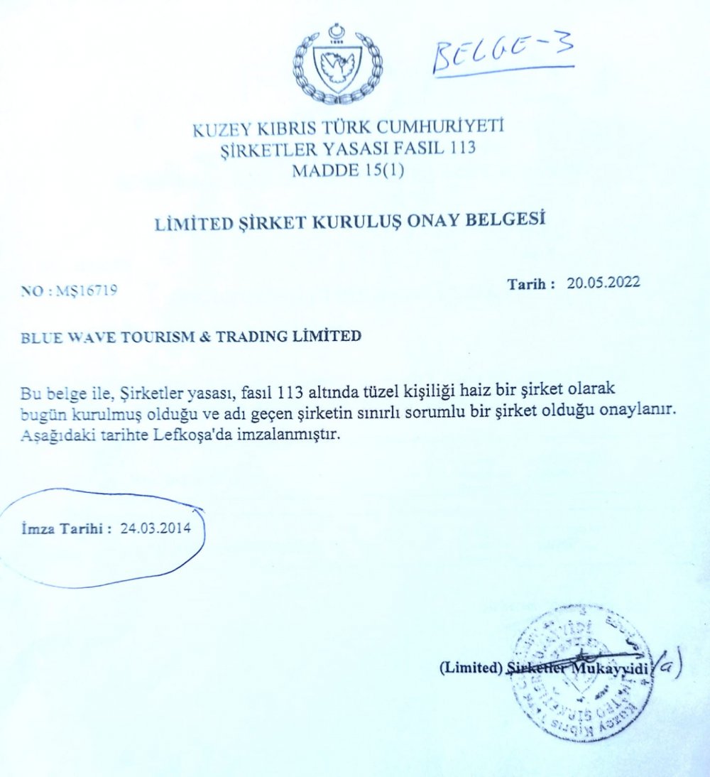 Kararda sözü edilen BLUE WAVE TOURİSM &TRADİNG LTD. Şirketi, Tüfekçi tarafından 24 Mart 2014'de kuruldu.