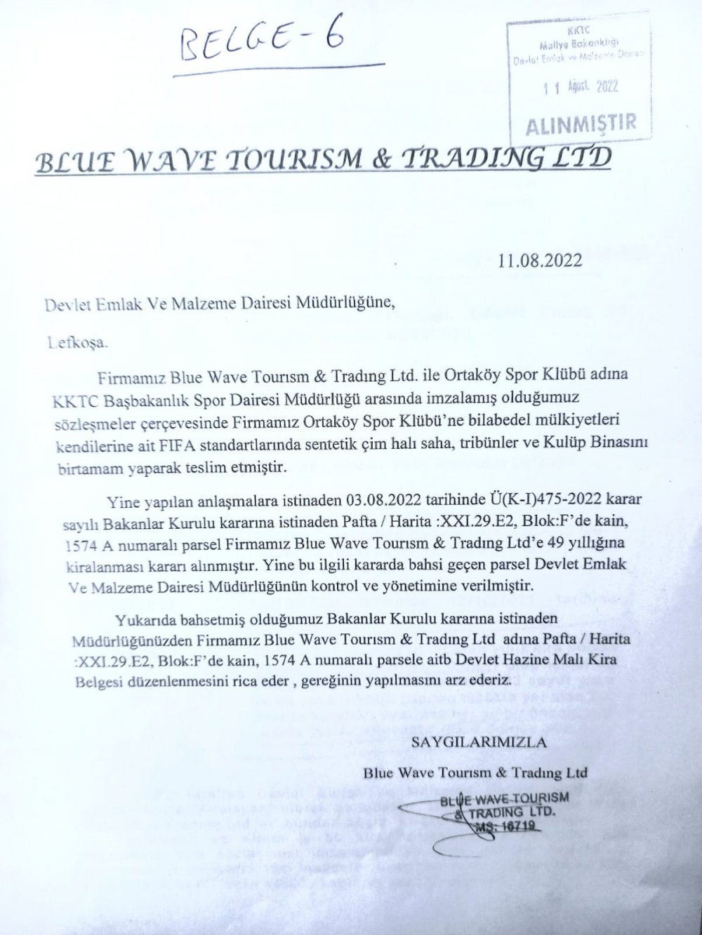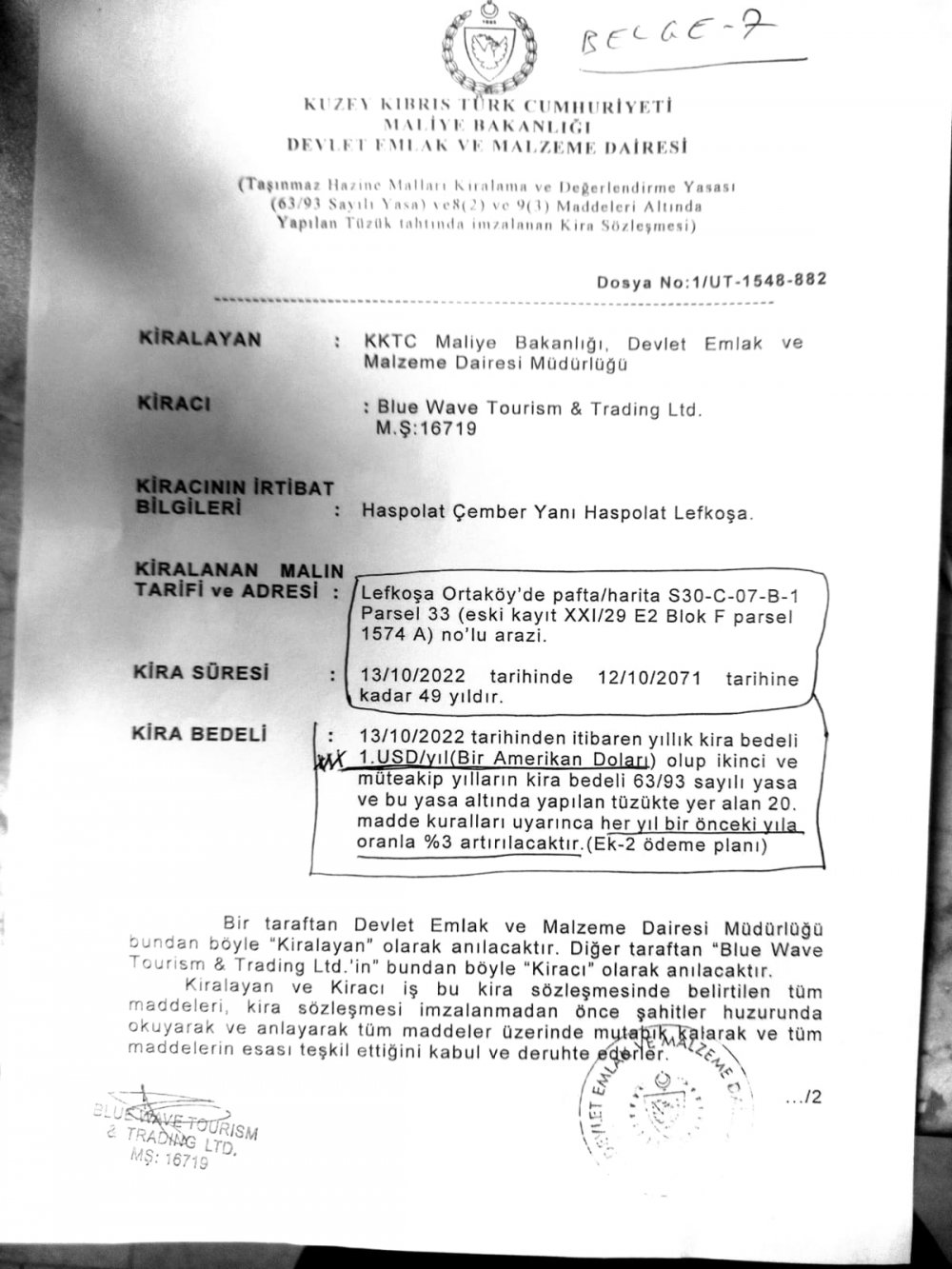 6 gün sonra ise, 13 Ekim 2022'de Devlet Emlak ve Malzeme Dairesi ile BLUE WAVE TOURİSM & TRADİNG LTD. arasında 12.10. 2071'e kadar, 49 yıl geçerli olacak bir kira sözleşmesi imzalandı. ( BELGE 7 )