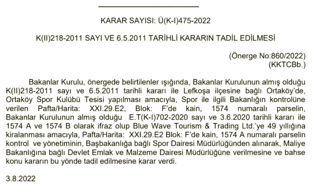 Kararda, kendisine, yani Başbakanlığa bağlı olan Spor Dairesi Müdürlüğü kontrol ve yönetiminde olan Ortaköy Spor Kulübüne ait " PAFTA/HARİTA:XX1/29 E3,BLOK F'de PARSEL 1574 A " numaralı arazinin, Spor Dairesi'nden alınarak, DEVLET EMLAK VE MALZEME DAİRESİ'NE DEVRİNE;