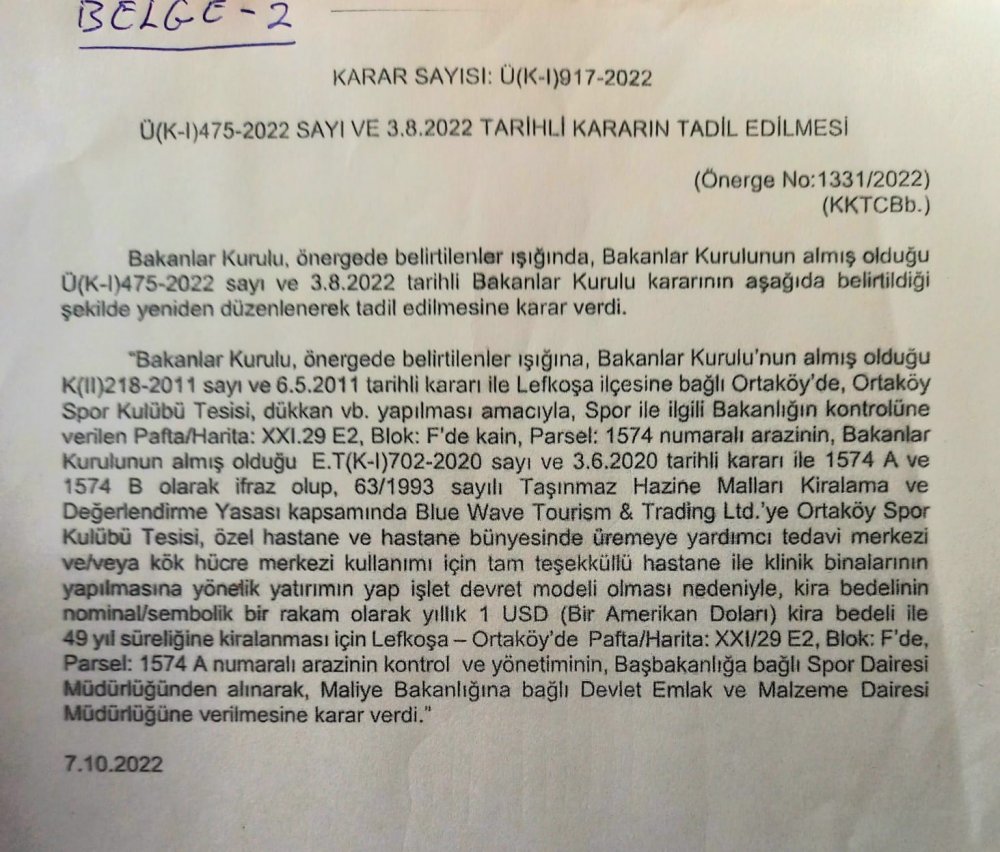 Bu amaçla, arazinin yılda 1 Dolar kira ile 49 yıllığına Tüfekçi'ye ait " Blue Wave Tourism & Trade Ltd"e kiralanmasına karar verdi. ( 1. BELGE: 3 Ağustos 2022 tarihli karar. 2. BELGE: 7 Ekim 2022 tarihli karar )